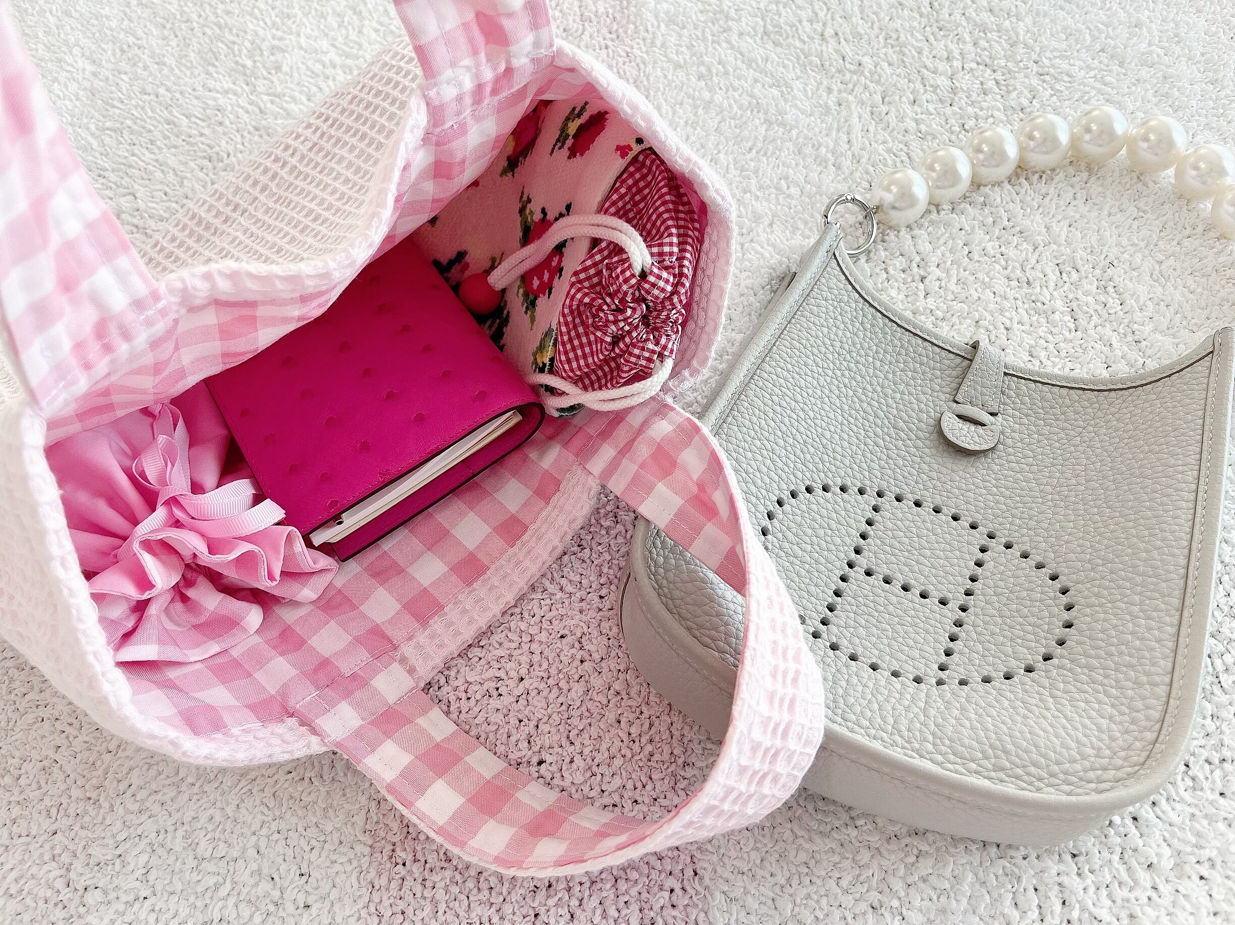飲み物(タンブラーやペットボトル)、ポーチ、手帳など