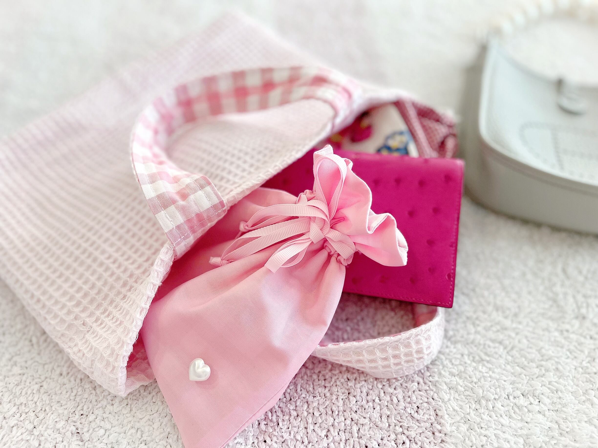 可愛らしいパウダーピンクの生地は